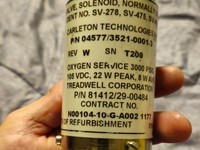 Carleton Technologies Solenoid Valve, S/N T40. Oxygen/Distilled Water service, rated 3000 PSIG. 105 VDC, 22W peak / 8W avg. Clean...